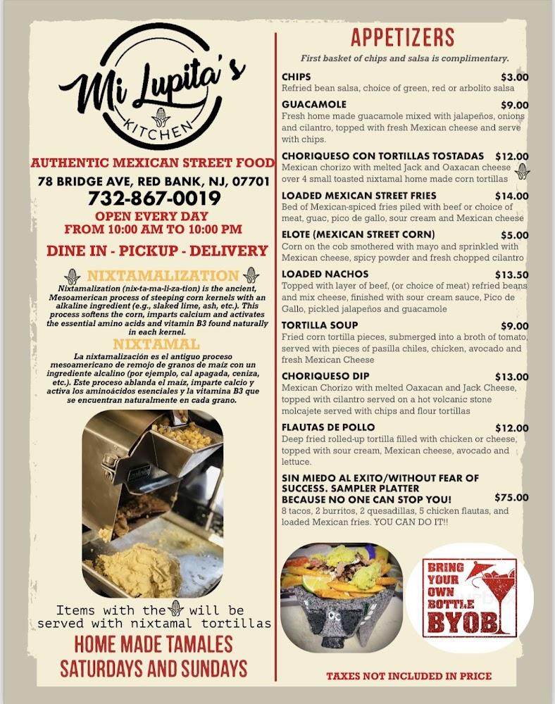 Welcome to Mi Lupita's Kitchen, your go-to destination for authentic street Mexican food in Red Bank, NJ! Located at 193 Shrewsbury Ave, we offer a delightful menu featuring traditional dishes perfect for lunch, dinner, or a quick bite. Enjoy our warm, casual atmosphere with the option to dine on our spacious terrace or take your meal to go. With quick service and a kid-friendly menu, we cater to everyone, including groups and solo diners. Plus, we provide accessible facilities and the convenience of mobile payments, ensuring a seamless dining experience. Come savor the vibrant flavors of Mexico today!
